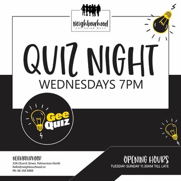 Neighbourhood quiz night – every Wednesday 7pm! Round up your cleverest friends and enjoy a night of fun, laughter and friendly rivalry! Bookings strongly recommended.